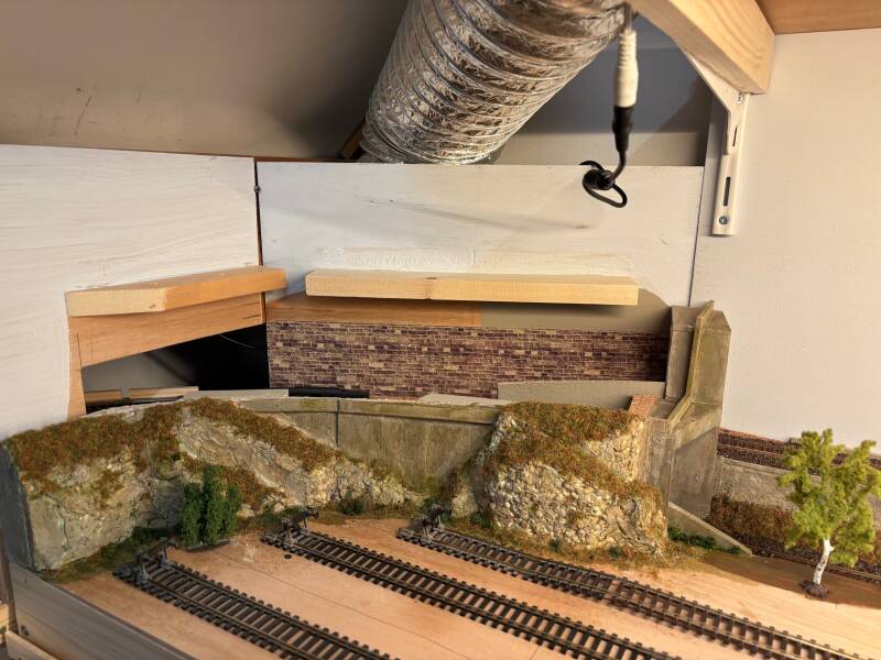 Dan de hoek naar het schaduwstation. Om de toegang naar het schaduwstation enigszins een natuurlijk verloop te geven, is hier een (deel van een) heuvel met tunnelingangen neergezet. De heuvel dekt tevens de afzuiginstalatie van de woning af. Omdat de hoek bereikbaar moet zijn, is de heuveltop afneembaar en zijn de achtergrondplaten allemaal (zonder breekwerk) los te halen. De heuvel krijgt nog wat meer groen. De hoek wordt verder afgewerkt met een 'plafond' en aan de voorzijde wordt de baan gedicht met uitneembaar plexiglas.