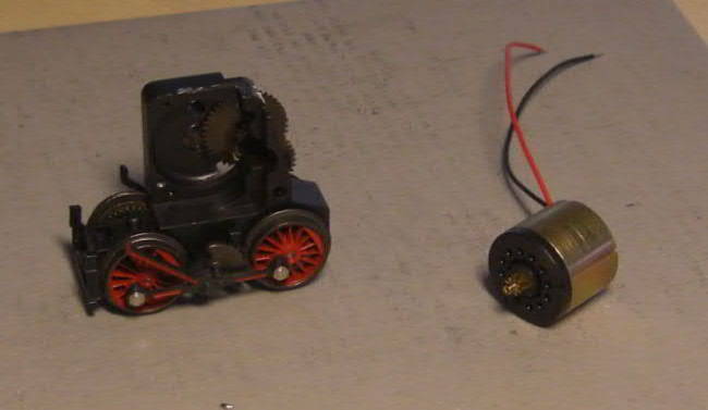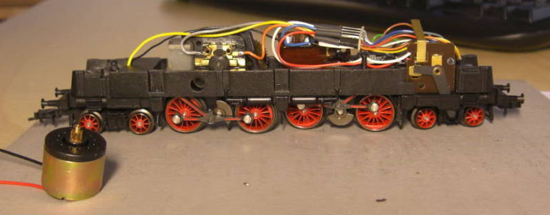 Het chassis met de originele motor, ingesoldeerde NEM652 interface en een decoder.