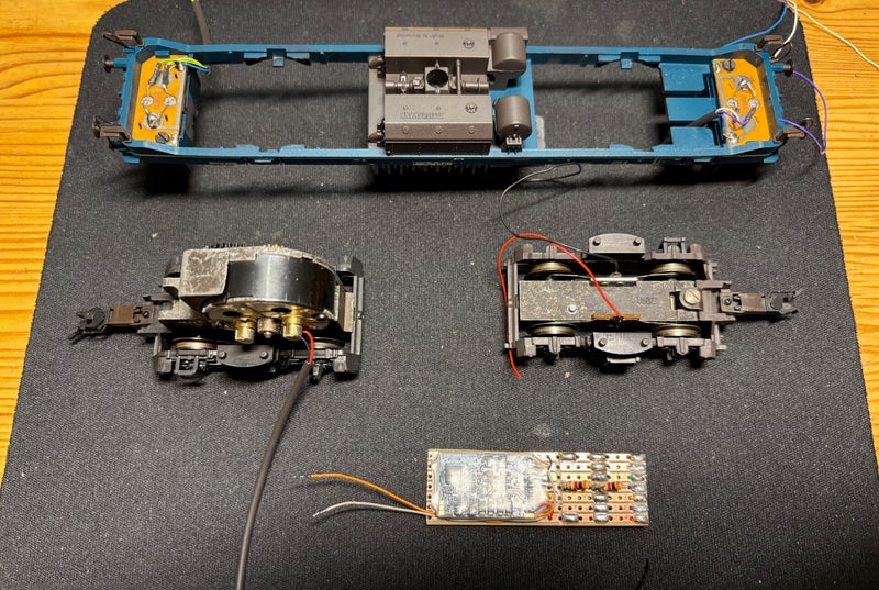 De decoder is met tape op een op maat gezaagd printplaatje geplakt. Wat extra ruimte aan soldeerbaantjes, is gebruikt om e.e.a. ordentelijk in elkaar te solderen. Nadat het nieuwe printplaatje in elkaar is gesoldeerd, is de loc op het programmeerspoor gezet en zijn een aantal CV's aangepast.