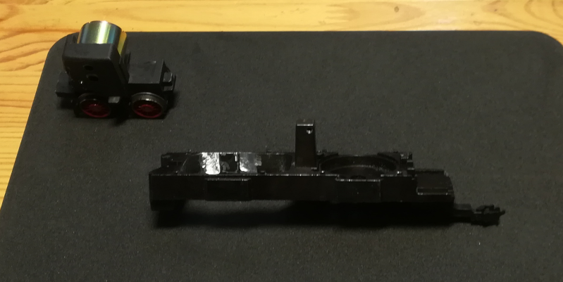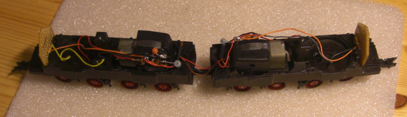 Dit model is twee keer aangepakt. De eerste keer is het gedigitaliseerd met één decoder en een elektrische verbinding tussen beide delen. De tweede keer is de goed rijdende, maar lawaaiige Märklin motor vervangen door een klokankermotor.