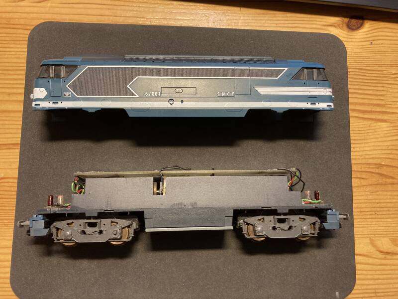 Dit keer is het een Lima uit 1996 waar een decoder ingesoldeerd wordt. Het gaat om de SNCF 67061, cat.nr. 208009. Deze versie heeft een centraal geplaatste motor met cardan aandrijving die alle assen aandrijft. De stroomafname verloopt via alle wielen. Twee wielen zijn voorzien van anti-slip-bandjes.Verder heeft de Fransoos front- en sluitverlichting middels gloeilampjes.